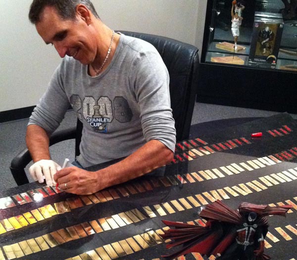 ↓ Todd McFarlane正在為1-300號的雕像名牌簽名。