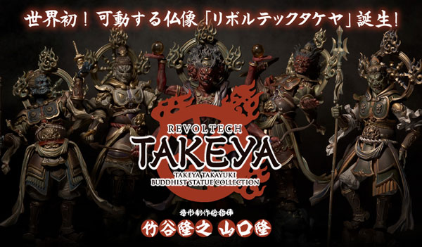 融合了雕像技術最高境界的作品“佛像”,以及海洋堂玩具“REVOTECH”的高度可動,這個全新的系列叫做“リボルテック タケヤ”(REVOTECH TAKEYA)!リボルテック タケヤ 首波商品將推出佛教神話中位於世界中心的須彌山上四大護法之一北方的“多聞天”(東方:持國天、南方:增長天、西方:廣目天、北方:多聞天)。リボルテック タケヤ 將以竹谷隆之大師的造型功力,傳達出“佛像”在雕刻中最高層次、以及最深奧的表現手法;另一方面結合了REVOTECH 所擁有的高度可動技術,企圖向我們展現過去我們未曾見過的佛像表情。