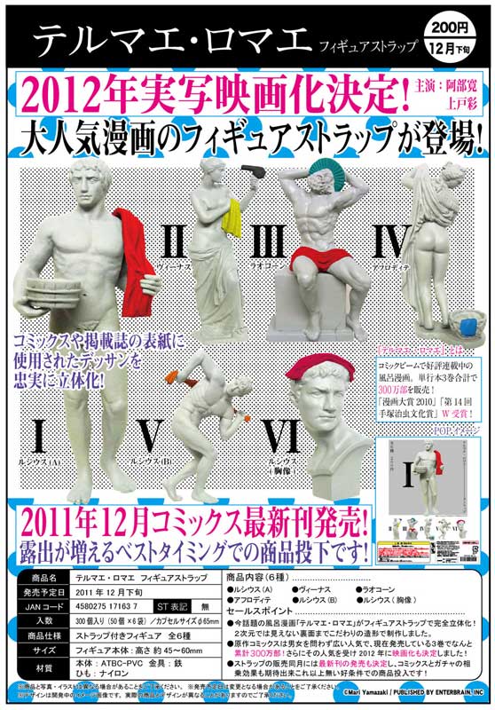 玩具新聞 日系 轉蛋&扭蛋 奇譚俱樂部 羅馬浴場 羅馬浴場完全立體化新作推出! 玩具課長 2011-12-13 23:13:22 分享 ✕ 分享 已複製網址 分享到 Facebook 分享到 LINE 分享到 Reddit 分享到 Twitter 分享到 Plurk 分享到微博 以獨特澡堂為題材、獲得「2010漫畫大賞」以及「第14回手塚治蟲文化賞」的搞笑漫畫「羅馬浴場」,緊緊推出3本單行本就突破300萬本銷售量。近日預告2012年真人電影即將上映。如此熱門趨勢讓奇譚再推吊飾第2彈!這次作品與先前介紹半立體作品不同,這次可是完全立體化喔!除了搞笑風格不變,這次將角色身上的沐浴設備特別著上鮮豔色彩,讓整個作品有喜感又有設計感!這樣優秀的作品高約5.8公分,,共計6款,每彈只要200日圓,提供大家參考! 玩具課長 十分老實的上班族,夜夜入眠想著的都是玩具公仔... 如果你也一樣睡不著,歡迎加入玩具人!