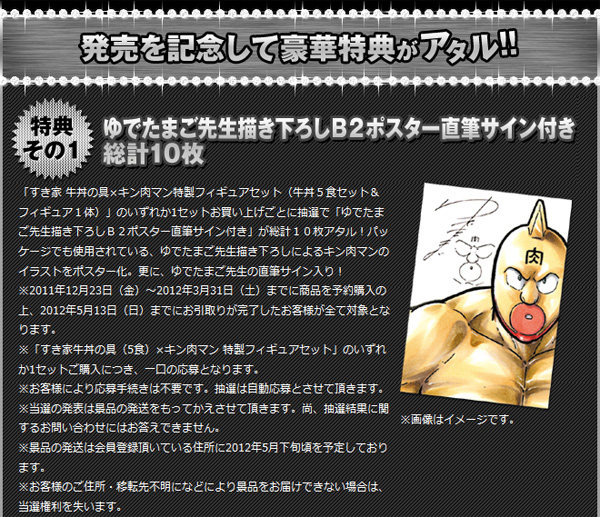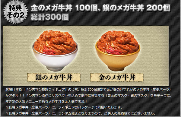 「すき家 牛丼の具×キン肉マン特製フィギュアセット(牛丼5食セット&フィギュア1体)」 ファミマ.com 限定商品,42011年12月23日~2012年3月31日開放預購,預計2012年4月24日開始發送,售價:8,970¥,共有兩種配色(紅、黃)各限定500組,並且將隨機抽選10組能夠獲得作者ゆでたまご親筆簽名B2海報,以及將有總計300組以故事中出現的「黄金のマスク・銀のマスク」為發想的“金のメガ牛丼”或“銀のメガ牛丼”混入其中。