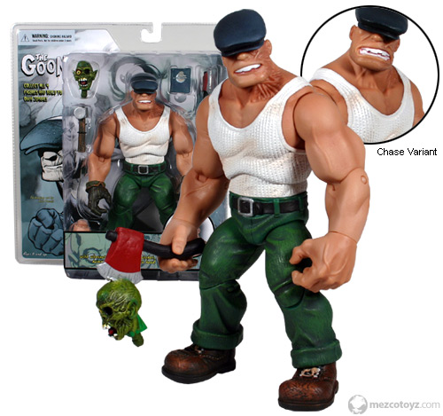 MEZCO TOYZ “The Goon” 現正發售中,高約七吋,全套一共四款:The Goon、Frankie、Joey the Ball以及Zombie Priest,每款附有一個殭屍零件,收集全套能夠組合出一款完整的殭屍,並有一款The Goon 齜牙咧嘴的變體版。