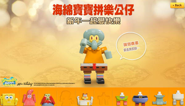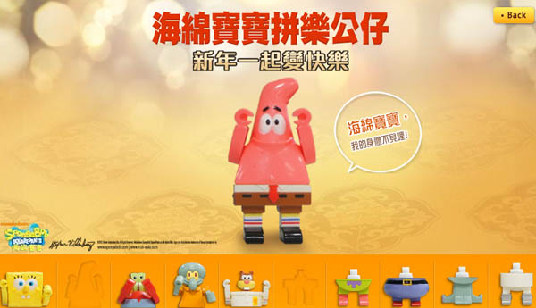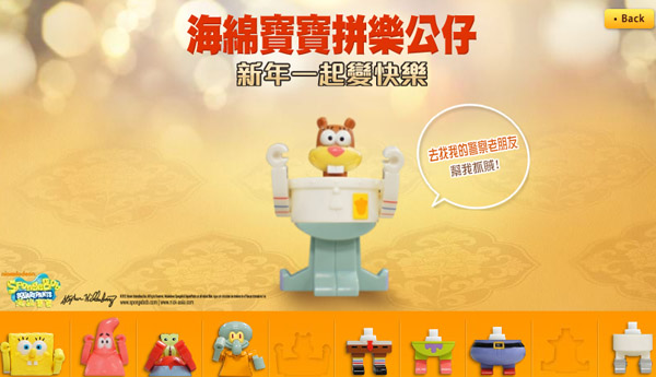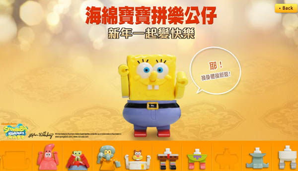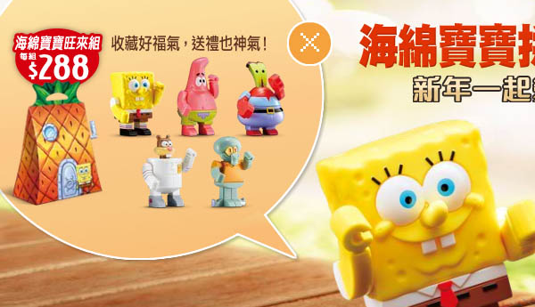 不知道麥當勞的兒童餐開發部門有沒有再看玩具人的網站,才提到上次受歡迎的兒童餐玩具是海綿寶寶系列,最近在台灣麥當勞的兒童餐贈品區又看見海綿寶寶拼樂公仔,還限量60萬個,不過價錢也較之前的兒童餐玩具貴10元,單買是一個49元,可以搭配點兒童餐不過必需要加10元後才可以有海綿寶寶拼樂公仔,一套五款主要角色有海綿寶寶、派大星、章魚哥、姍迪和蟹老闆,每款都可以互換下半身或是上半身,也可以一次購買一組五個多附一個海綿寶寶的鳳梨屋的紙盒288元,有興趣的玩具人可以去家附近的麥當勞看看。