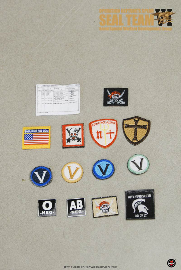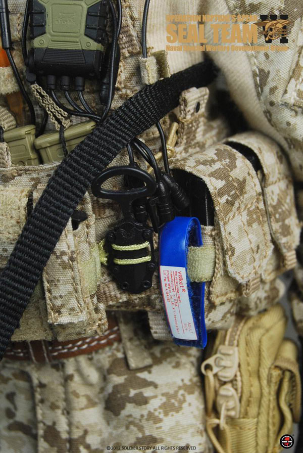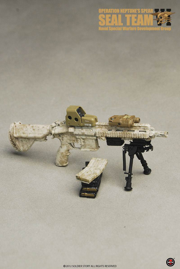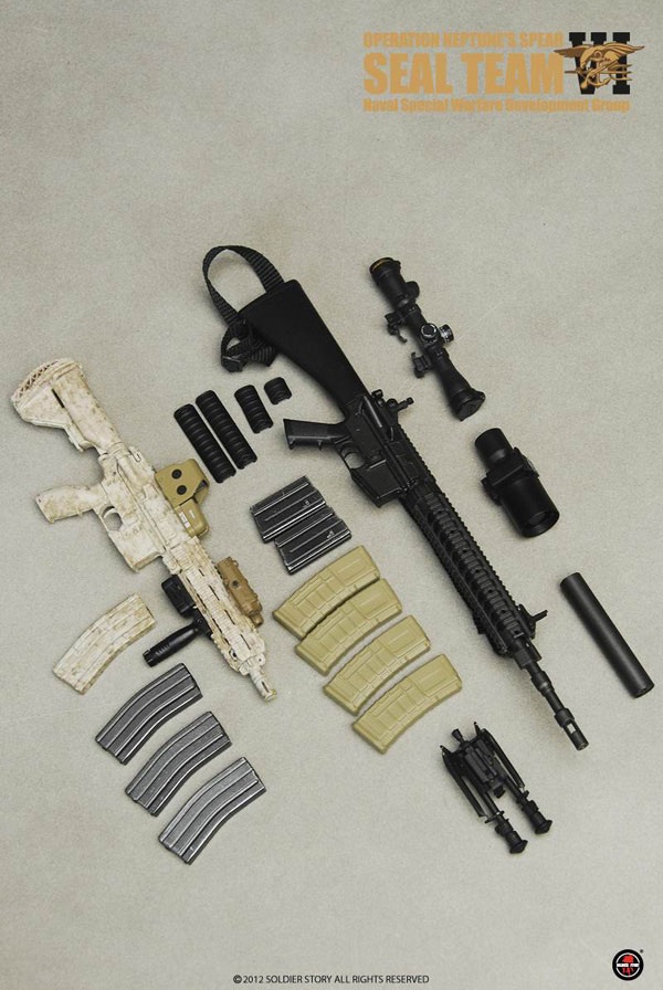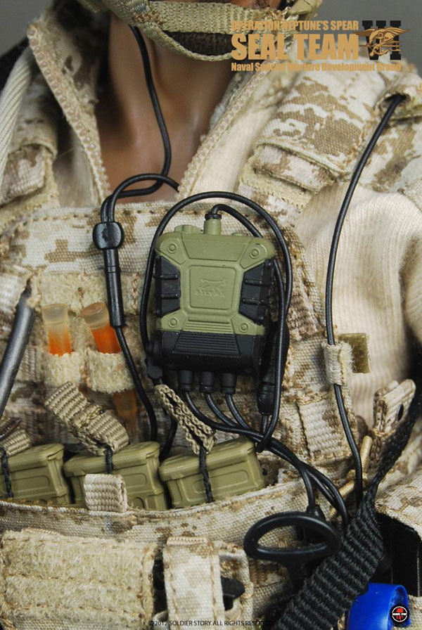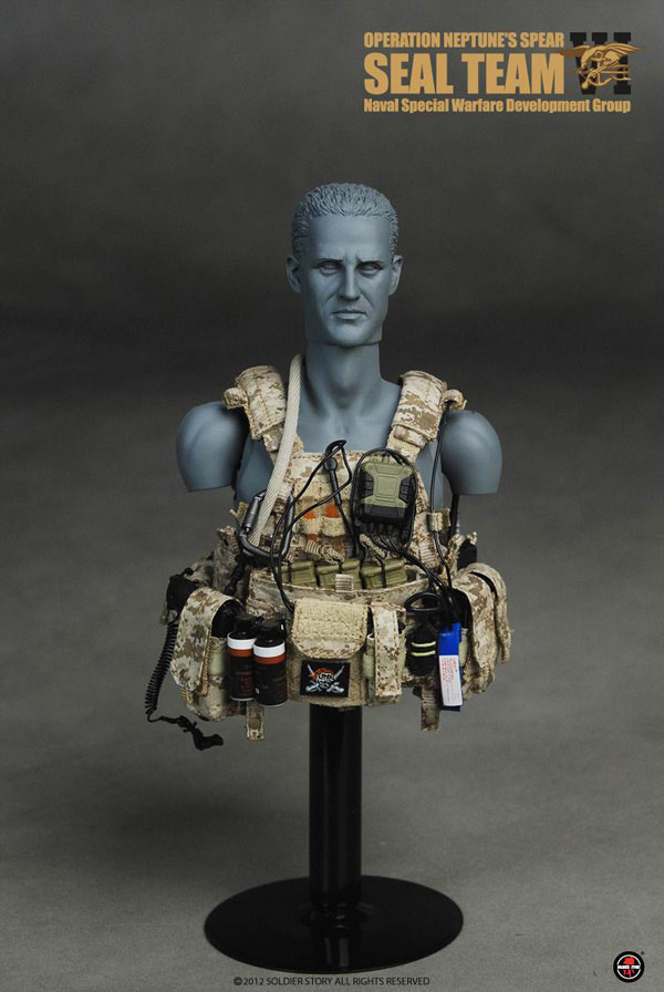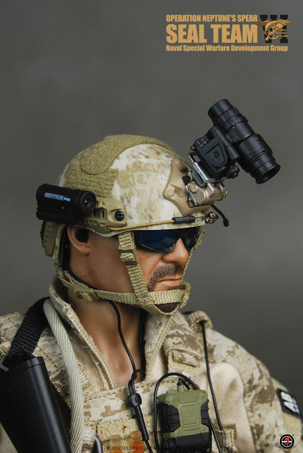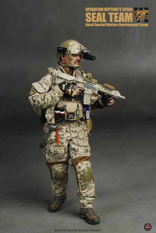 以驚人高水準品質軍事玩具人偶迅速崛起的香港廠商“Soldier Story” ,推出了最新的1/6 “海神之矛”行動特別版海豹隊(OPERATION NEPTUNE’S SPEAR SEAL TEAM VI)。以實際中真實展開於美東時間2011年5月1日的“海神之矛行動”,突擊並擊斃911事件重要嫌犯、同時也是伊斯蘭教激進派的基地組織領導人奧薩瑪·賓·拉登的任務為藍圖製作,重現了當時執行此一任務的美國海豹部隊特戰開發小組(正式簡稱為NSWDG,又稱為DEVGRU、海豹第六分隊等)。