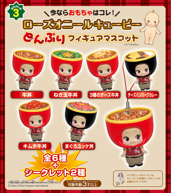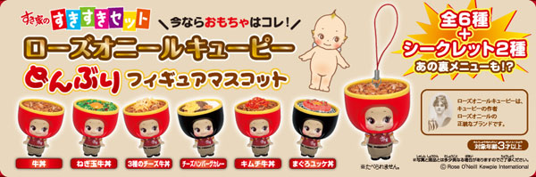 上次我們介紹過,日本最大的牛丼連鎖店“すき家”(SUKIYA)與造型公司CCP合作,推出了“牛丼の具×キン肉マン特製フィギュアセット”,總計1000組的數量瞬間完售!すき家趁勝追擊,再度推出牛丼碗公頭的Q比(Kewpie)吊飾!即日起,只要到すき家消費+130¥即可隨機獲得一款“『ローズオニールキューピー』どんぶりフィギュアマスコット”吊飾,一共全部6種+2款隱藏!對Q比有愛的玩具人千萬別錯過呀!