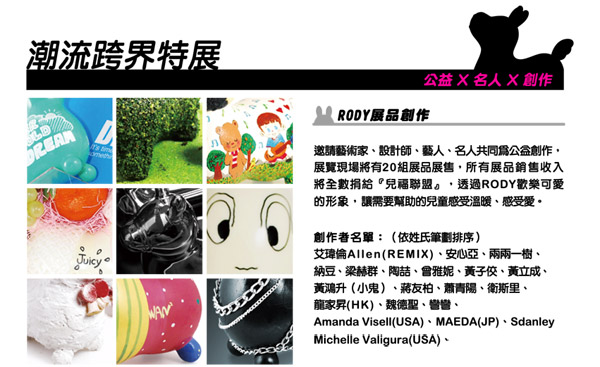 跳跳馬RODY,從最早期義大利開發的兒童玩具,到日本取得版權之後,藉由平面肖像化了開發許多各領域的延伸商品,跳跳馬RODY搖身一變成為許多人的最愛。由藝墨集團獨家代理引進台灣的RODY,將舉辦『Enjoy RODY! Enjoy LOVE!潮流跨界特展』邀請許多國內外藝術家、設計師、藝人、名人共同為公益創作了20組作品展售,所有展品銷售收入將全數捐給『兒福聯盟』,透過RODY歡樂可愛的形象,幫助許多小朋友與他們的家庭走出生命困境。
