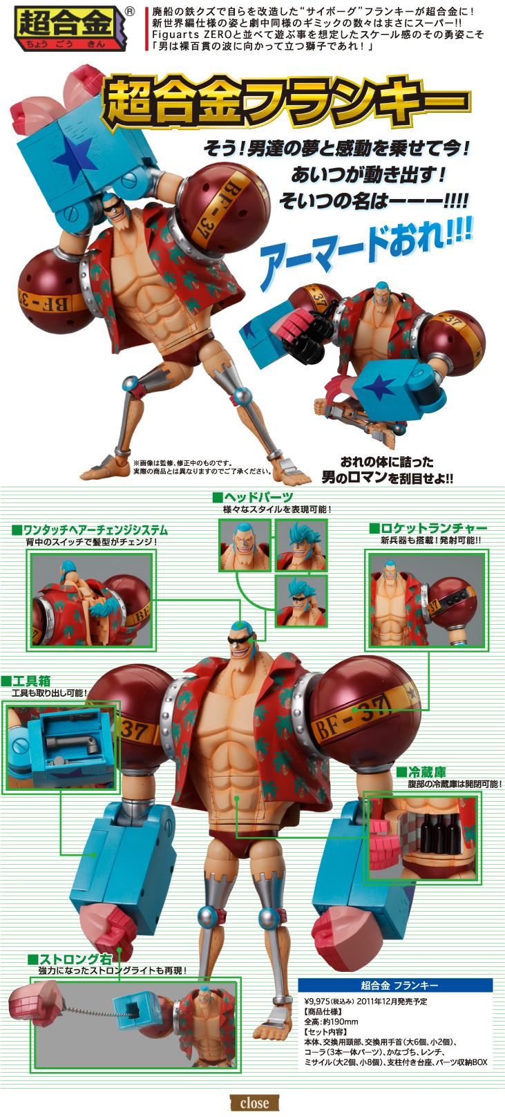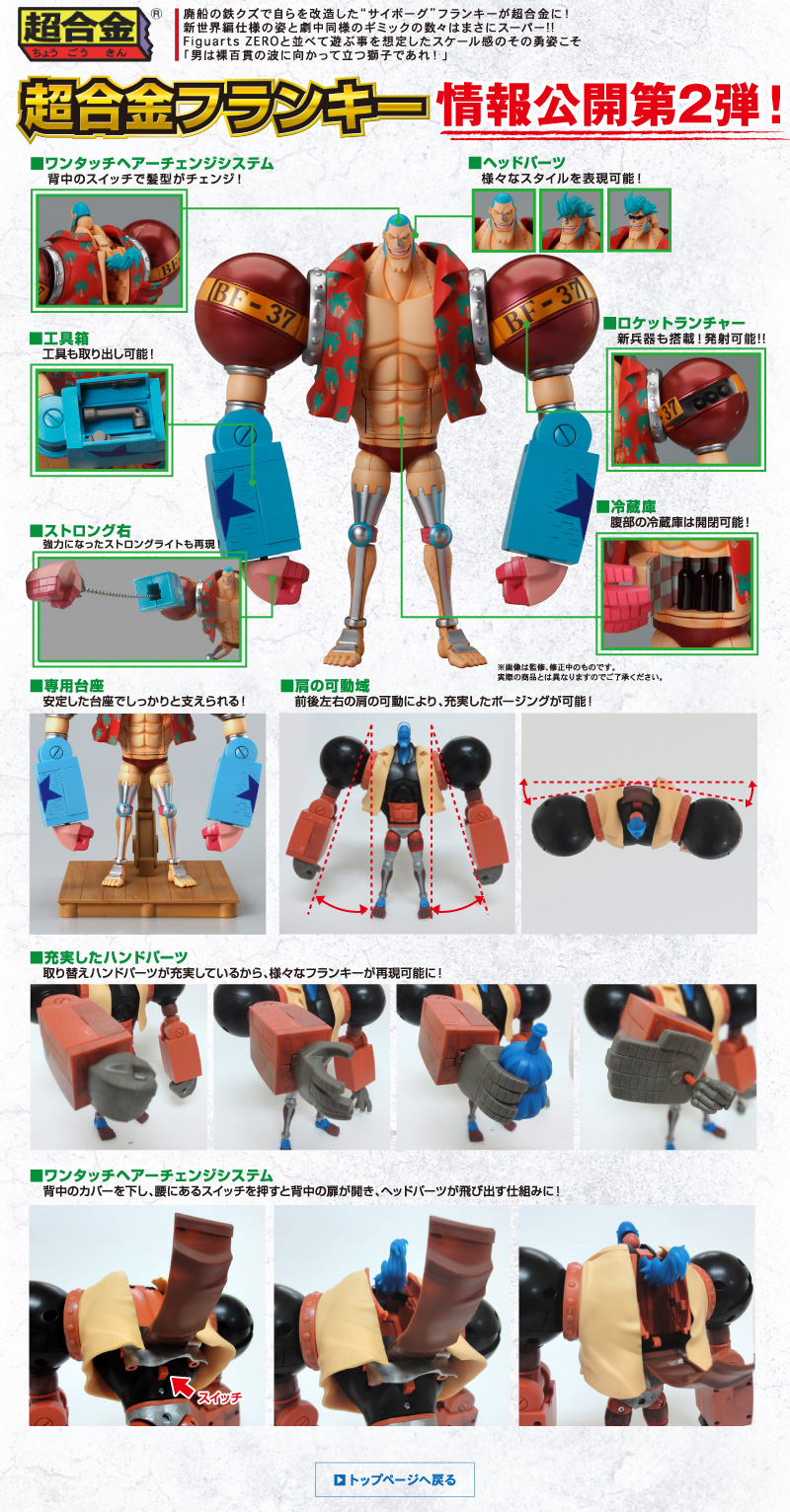 玩具新聞 BANDAI 日系 海賊王 BANDAI 超合金 One Piece 法蘭基(新世界篇) 熊倒 2011-09-22 17:10:03 分享 ✕ 分享 已複製網址 分享到 Facebook 分享到 LINE 分享到 Reddit 分享到 Twitter 分享到 Plurk 分享到微博 BANDAI 超合金 One Piece 法蘭基(新世界篇)価格(税込):9,975円 発売日: 2011年12月 這可是海賊王中,最合適推出超合金版的角色啊! ↓點小圖看大圖! ↓點小圖看大圖! 熊倒 玩具熱愛者與情色蒙面藝術家的Rockin'Jelly Bean的信徒。對12吋、吊卡玩具以及復古造型有莫名的狂熱。