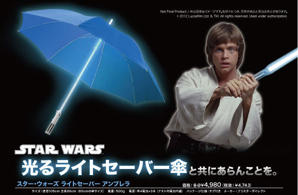 又是Starwars星際大戰的周邊商品,繼前陣子推出過受到相當歡迎的星際大戰的光劍造型筷子,這次將繼續由Blister Direct公司執行製作出STAR WARS LIGHT SABRE UMBRELLA 有DARTH VADER黑武士和LUKE SKYWALKER天行者路克兩款,宣傳照片中的雨傘可以像光劍那樣子發光,還兼具照明功能的雨傘應該會受到很多同好的喜愛,雨傘張開直徑約105公分,全長86cm(60cm約為傘的大小)售價約4,980元日幣,預計2012年7月推出,喜歡Starwars星際大戰的玩具人可以考慮一下歐!