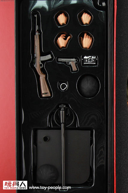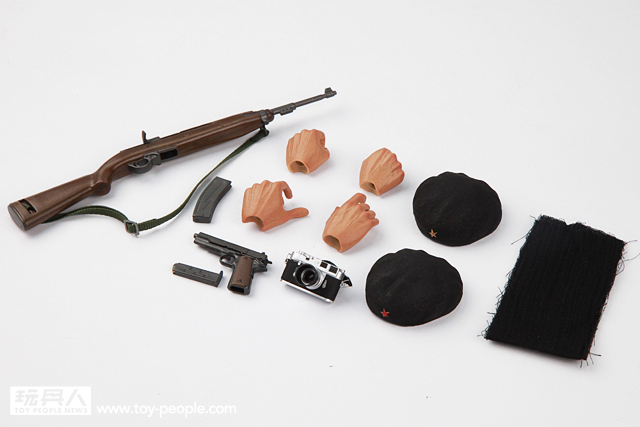 ↓ 配件一覽,一共附有:M2卡賓長槍、兩對可替換手型、M1911手槍、舊式相機、紅色一星貝雷帽以及金色一星貝雷帽。