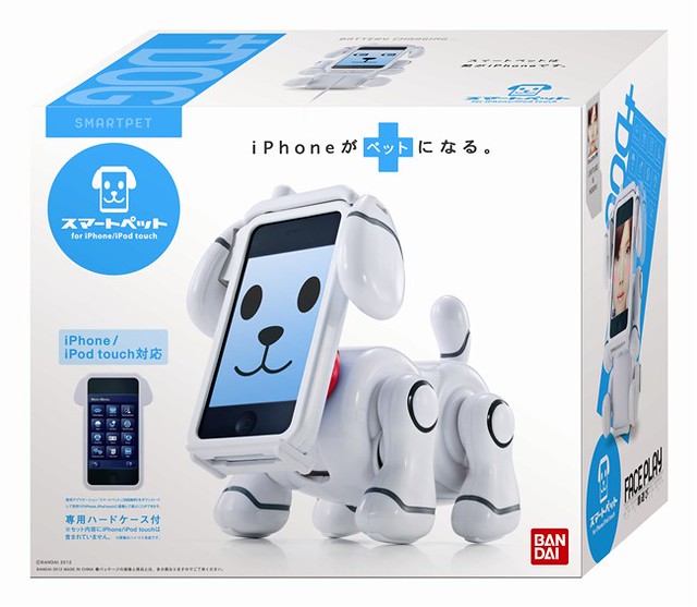 由日BANDAI萬代玩具公司在2012年04月下旬預計推出的SMART PET SMP-501W 智慧手機寵物狗,可利用手機免費下載App 的SMART PET程式對應在自己的iPhone上,在裝置這個SMART PET SMP-501W ,就可以擁有一隻專屬你自己的iPhone小狗,目前可用於iPhone4S/4・iPhone3GS・iPod touch第4世代等等的三種蘋果系列的手機,充電狀態的模樣真可愛,還有很多小狗的臉可供選擇,售價約6,480元日幣,喜歡這類3C 智慧手機寵物狗的玩具人可以參考一下。