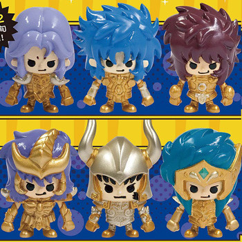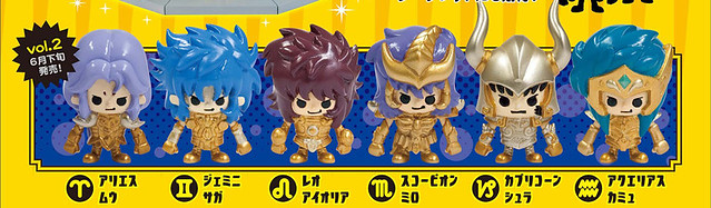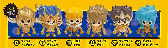第一彈內容:處女座沙加(バルゴ シャカ)、天秤座童虎(ライブラ ドウコ)、射手座艾奧羅斯(サジタリアス アイオロス)、巨蟹座迪馬斯古(キャンサー デスマスク)、雙魚座亞夫羅迪(ピスケス アフロディーテ)、金牛座亞魯迪巴(タウラス アルデバラン)以及隱藏。