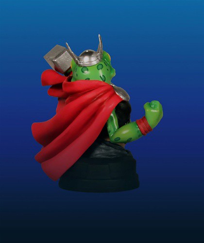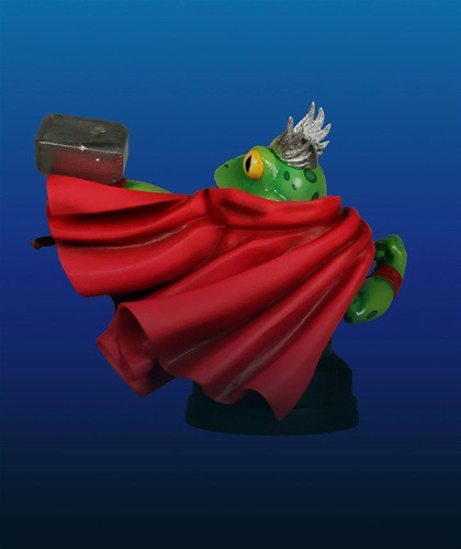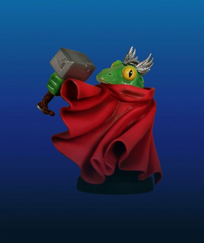 受洛基陷害變成青蛙的索爾,堪稱史上最脫力的橋段,如今這經典劇情被玩具公司Gentle Giant推出立體化雕像。相較孔武有力、所向無敵的索爾,便身成青蛙還真讓人認真不起來。本商品高約11公分,美金參考售價約45美元,2012年3月推出已經銷售一空,有興趣可以上拍賣找找!(參考資料來源:http://tw.myblog.yahoo.com/wind-zhou/)