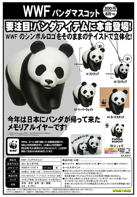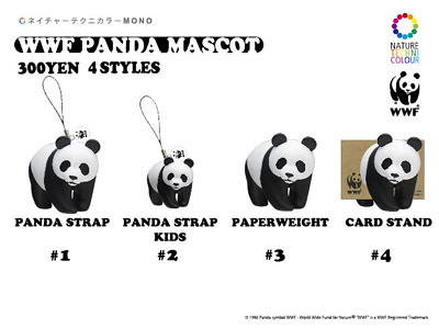 奇譚俱樂部 - ネイチャーテクニカラーMONO WWFパンダマスコット 預計2012年4月發售,一共推出4個款式:熊貓吊飾、熊貓小孩吊飾、紙鎮以及名片夾。轉蛋販售,每轉參考價格300¥