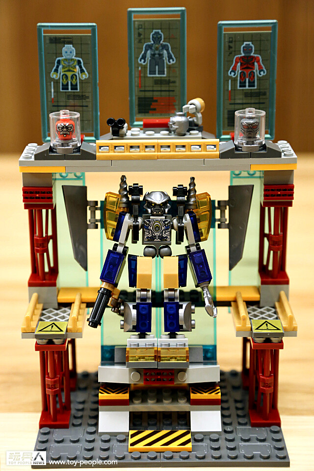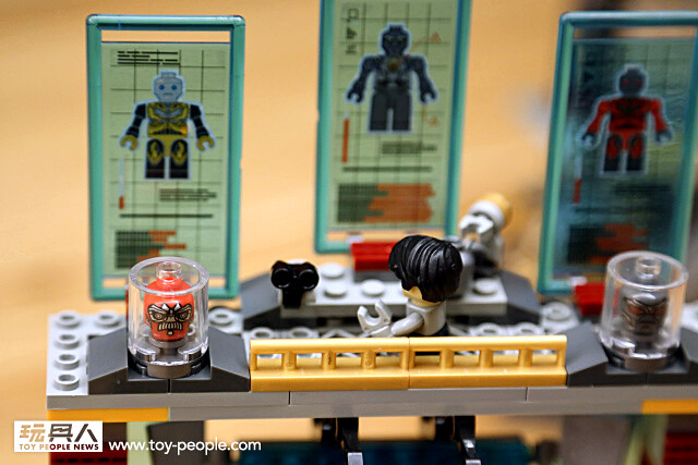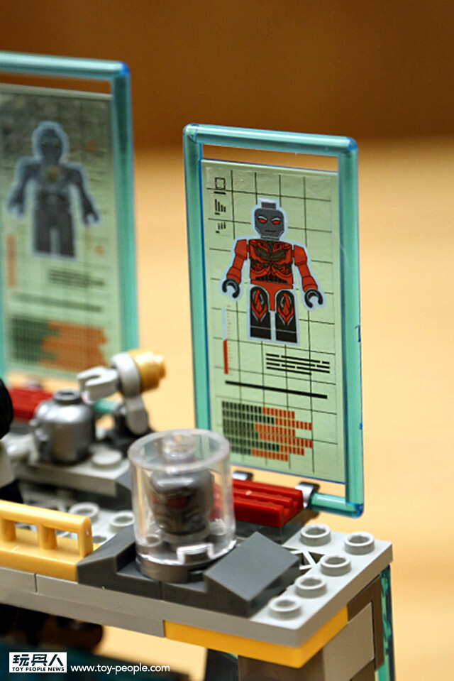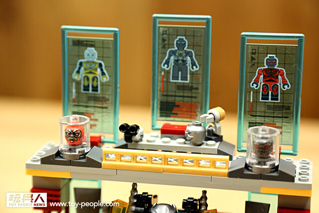 ▼ 除此之外,這個場景組另一個相當用心的就是二樓的實驗室場景。利用積木打造出簡單造型的實驗器材,螢幕上還顯示著其它變形金剛的資訊,以及特殊容器中放著死去的變形金剛的“飛輪”與“鉛腿”的頭顱,真是令人不寒而慄...(這裡看了真令人不忍心啊~)