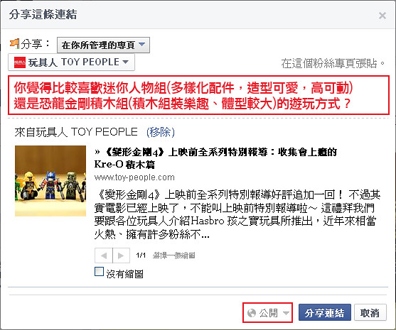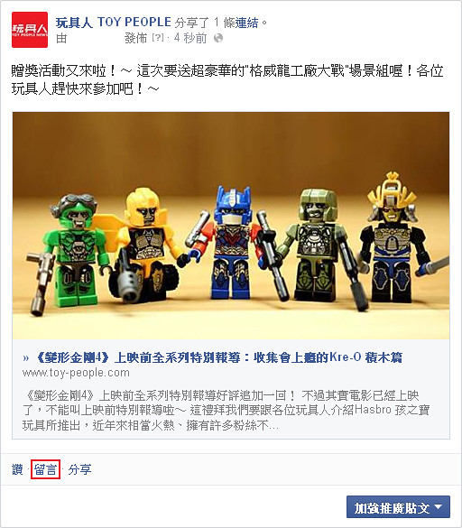 1. 到本次的「《變形金剛4》上映前全系列特別報導:收集會上癮的Kre-O 積木篇」開箱報告按“讚”,並分享至你的塗鴉牆上,分享時寫下你覺得“你覺得比較喜歡迷你人物組(多樣化配件,造型可愛,高可動)還是恐龍金剛積木組(積木組裝樂趣、體型較大)的遊玩方式?” 只寫“已分享”是鐵定不會中獎的喔!