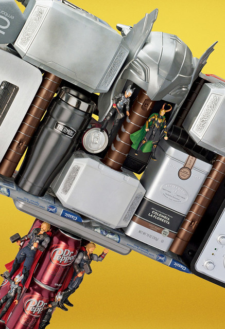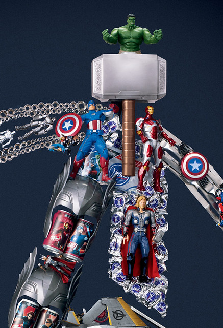 來自波蘭廣告公司Wieden + Kenned團隊的攝影作品 A Superhero in Every Aisle,運用很多日常生活用品做成複合媒材的商業攝影,可以看見漫畫英雄的造型或ICON都是由玩具公仔、飲料、鞋子、玩具積木、鉛筆等等所組合而成的,有看見使用很多小編愛喝的Dr.Pepper櫻桃可樂,十分有趣分享給喜歡電影復仇者聯盟的玩具人。