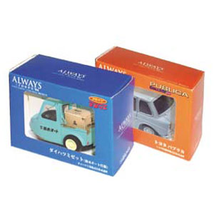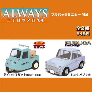 日本在2005年推出的電影ALWAYS 三丁目の夕日在2007年又推出續作 ALWAYS 続・三丁目の夕日,因應劇情出現的三輪車和自用車款等等,推出了ALWAYS 三丁目の夕日’64 プルバックミニカー'64 全兩種的車款縮小版本,已經在市面上發行以久,造型相當可愛很相似TOMY所出CHORO Q系列的可愛車型,預計在2012年5月再次販售,全長約5公分,售價約945元日幣,提供給喜歡Q車的玩具人參考。照片第七張之後是先前推出的版本,三輪車款顏色較深。