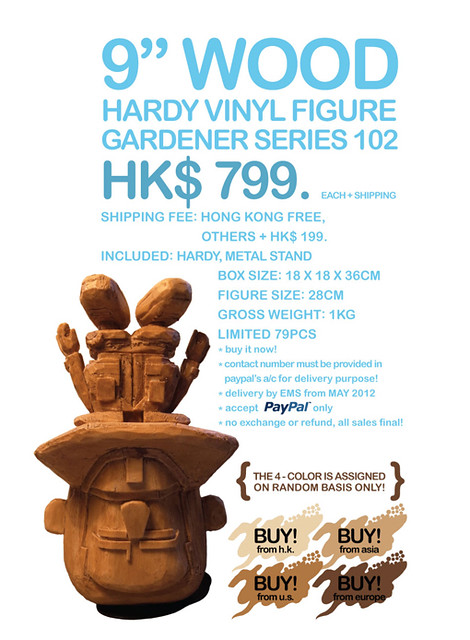 Michael Lau - 9" WOOD HARDY VINYL FIGURE 全球限定79隻,一共四種配色,Color 1.2.4 限定20 隻Color3 限定19隻,每支高約28公分,附屬一個金屬地台,售價799港幣(香港以外地區需外加199港幣運費)購買請至:crazysmiles.com