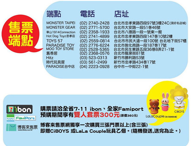 活動展覽 台北國際玩具創作大展 2012台北國際玩具創作大展 售票資訊 熊倒 2012-05-14 22:30:43 分享 ✕ 分享 已複製網址 分享到 Facebook 分享到 LINE 分享到 Reddit 分享到 Twitter 分享到 Plurk 分享到微博 2012台北國際玩具創作大展 售票資訊 展覽時間: 2012.7.5(四) ~ 2012.7.8(日) 展覽地點: 華山1914文創園區 東二A.B館 預售票預售時間: 2012.5.15(二) ~ 2012.7.1(日) 熊倒 玩具熱愛者與情色蒙面藝術家的Rockin'Jelly Bean的信徒。對12吋、吊卡玩具以及復古造型有莫名的狂熱。