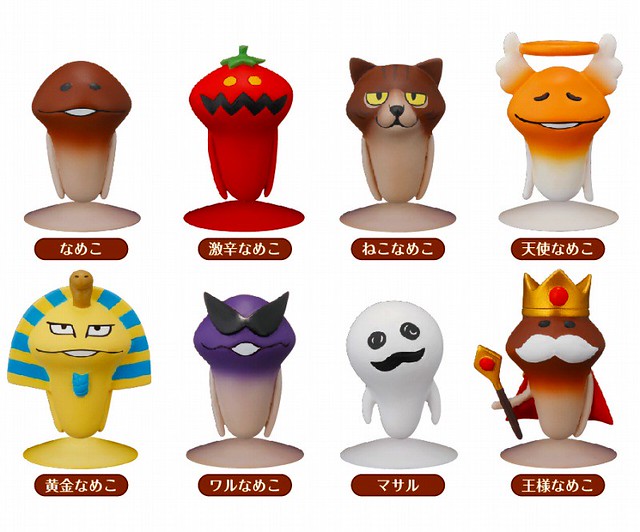 エンスカイ おさわり探偵なめこ栽培キットより 彩色済み吸盤付きマスコット 全套8款:普通菇、激辛菇、貓咪菇、天使菇、黃金菇、不良菇、幽靈菇以及國王菇,高約40mm,預計2012年6月30日發行,參考售價:一個380¥ 一盒2,390¥