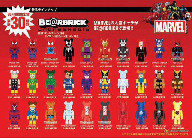 網路上流出了幾張關於MARVEL × BE@RBRICK unbreakable 的情報圖,將使用Specialくじ 迪士尼的販售方式,全套一共30 款,並且將有一定的機率能夠抽到400%的蜘蛛人,或是最後一張簽“L@ST”賞能夠抽到電鍍的100%黑色蜘蛛人。每款高約70mm,並付有鐵鍊可作為吊飾,預計6月29日上市。