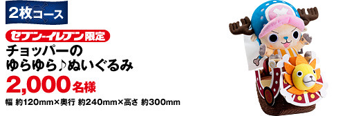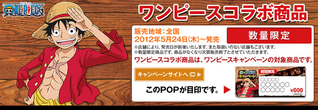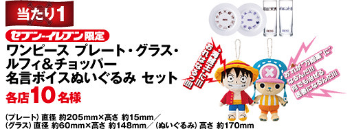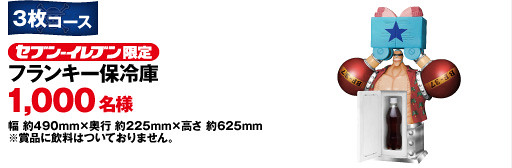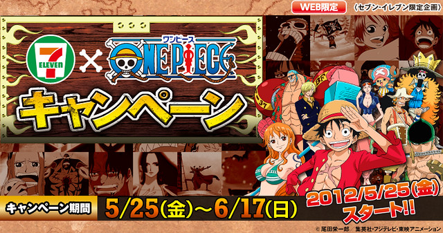 首先是在2012年5月25日展開的集點或贈獎活動,只要在7-11店內消費超過700¥,就有機會馬上中獎,或是集點抽獎,獎品相當豪華,包括了會說出經典台詞的海賊王人偶娃娃、任天堂3DS、佛朗基造型保冷庫(超讚!~)以及Figuarts Zero 7-11 限定台座版...等豐富大獎!