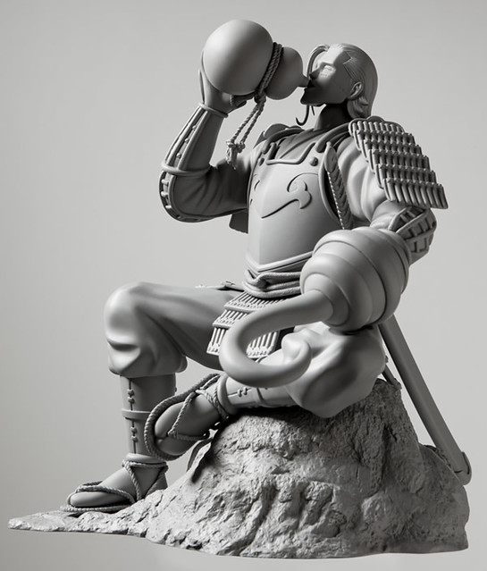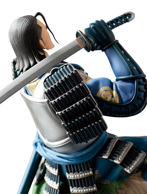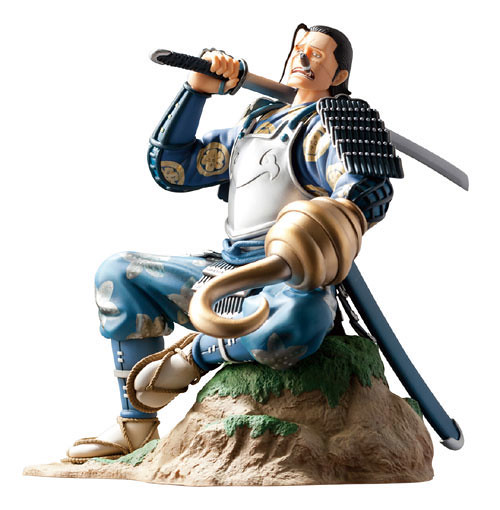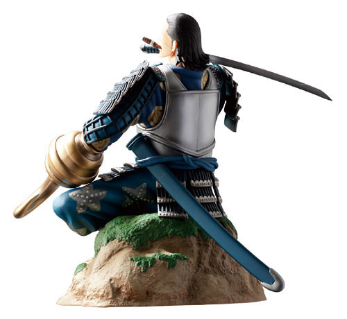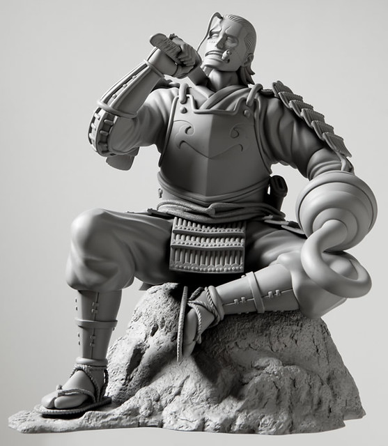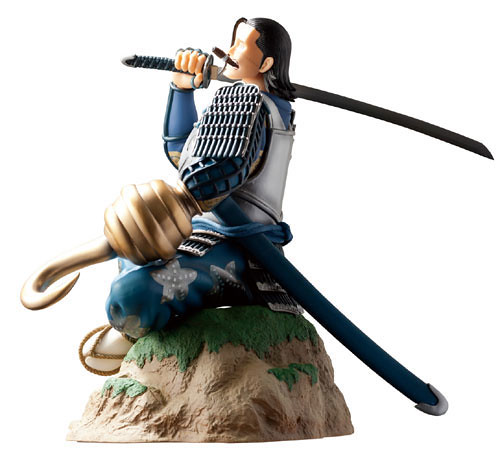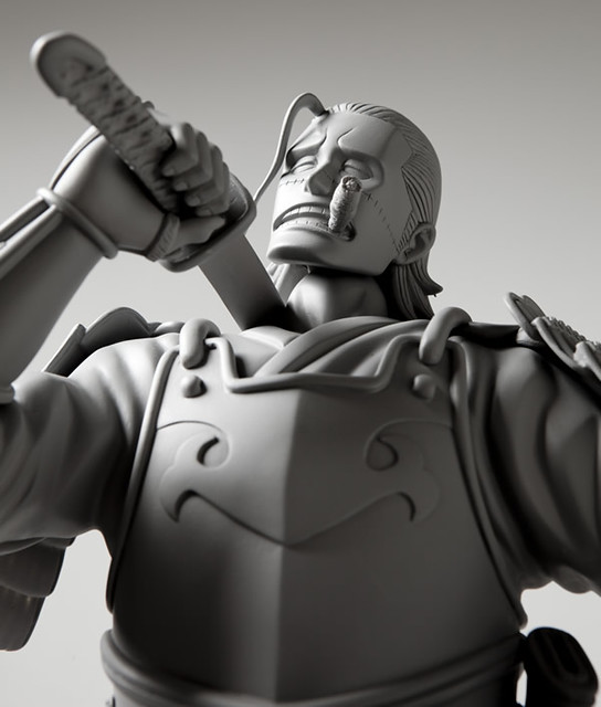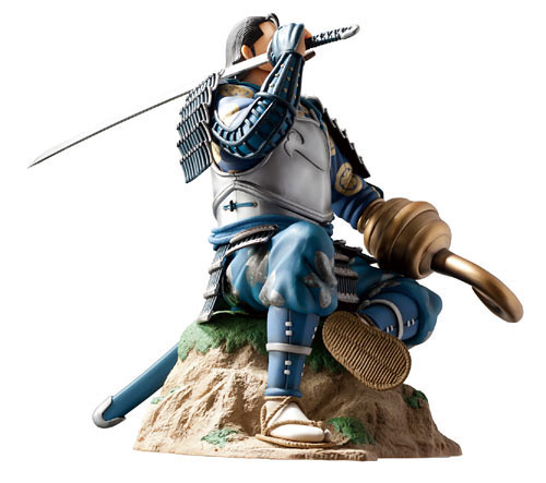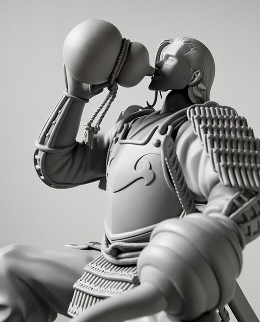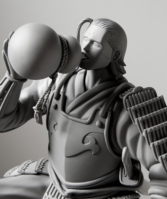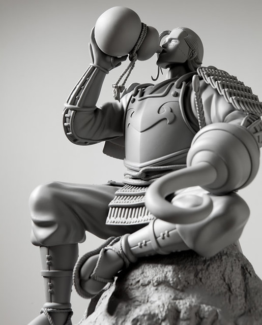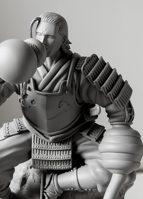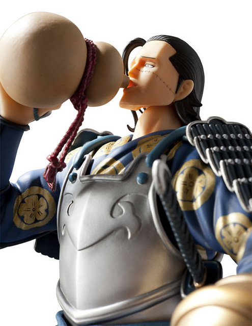 D.P.C.F第9號作品「武士克洛克達爾」近期揭露製作中的原型情報。從圖片來看設定是來自海賊王第547話「島破り」的刊頭插畫,一身藍白色華麗鎧甲的克洛克達爾正在豪邁飲酒。與原作略微不同的是克洛克達爾坐在特製的岩石台座上,這麼設定應該是將平面作品立體化的現實考量。同時藉由石頭台座更能展現克洛克達爾的高大體魄以及戶外飲酒的氛圍。本商品一樣附有配件可以替換,讓原設定中飲酒的姿態,變成手持武士刀、悠閒抽煙的模樣。