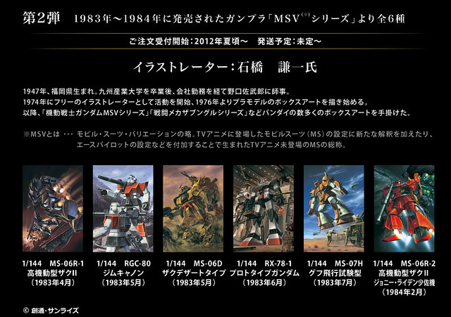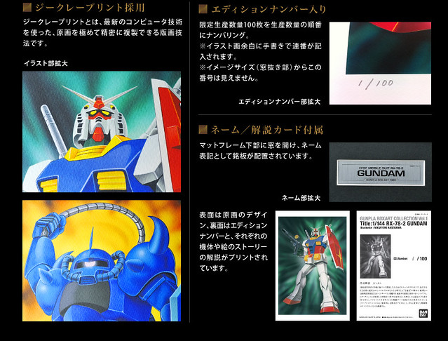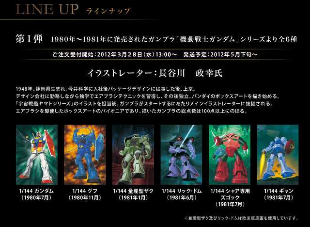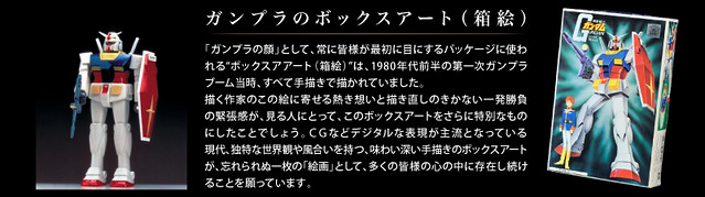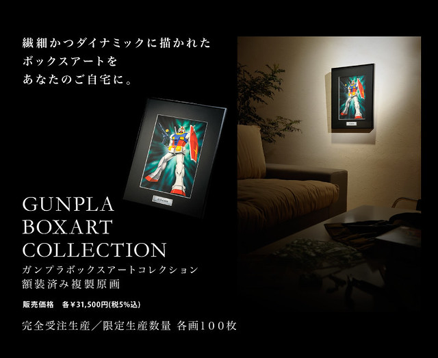 BANDAI 推出了全新系列商品“GUNPLA BOXART COLLECTION”,以高規格的絹印技術,將過去經典的鋼彈模型包裝盒原畫重新復活,第一彈由“長谷川 政幸”所繪製,於1980~1981年販售的“機動戰士ガンダム”,以及第二彈“石橋 謙一”繪製,1983~1984 發行的“MSVシリーズ”,每一款皆限定100張,裱褙含壓克力框、壓克力片,並附上流水編號以及解說卡,尺寸寬395mm × 高515mm,每幅複製畫售價31,500¥,另有同系列6張作品合購的組合,售價189,000¥