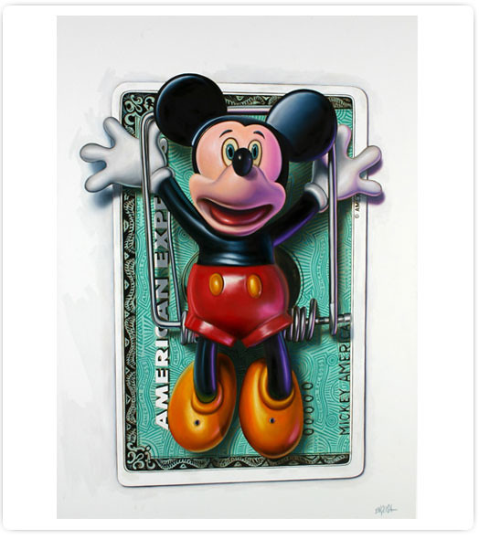 來自美國當代藝術家Ron English又有設計師玩具立體化的新作品,前陣子才熱賣過的胖東尼虎,最近又與玩具公司kidrobot合作推出American Depress,顛覆迪士尼經典米老鼠圖案,重塑現代流行文化的圖像,操縱視覺符號來幽默一下,變成胖胖米老鼠被夾在黑卡(信用卡)上面。