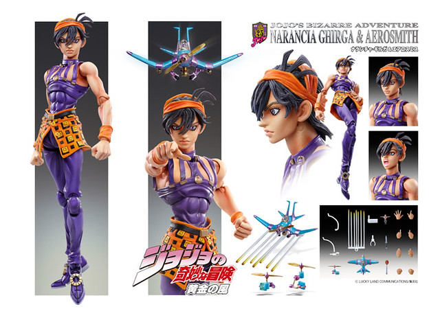 超像可動宣佈推出JOJO冒險野郎第五部「黃金之風」當中,布加拉提小隊成員「納蘭迦‧吉爾卡」與其替身「航空史密斯」(ナランチャ・ギルガ&エアロスミス)。自幼母親病死,父親當他是個礙事的傢伙。14歲的時候,遭到冤枉,被關進少年感化院,後來就在他垂死街頭的時候,認識了布加拉提,而成為布加拉提小隊成員。