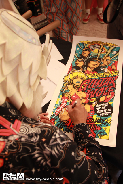 ↓ 現場也有很猛的粉絲帶來大師稀有的限量絹印作品。這張作品是2007年發行,日本R&R 車庫樂團“GUITAR WOLF”組成20週年紀念的「火星ツイスト」(CD&DVD) 宣傳海報2次色,全球限量200張。