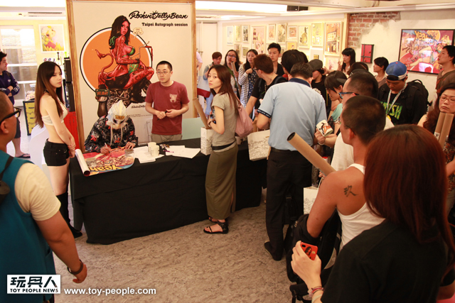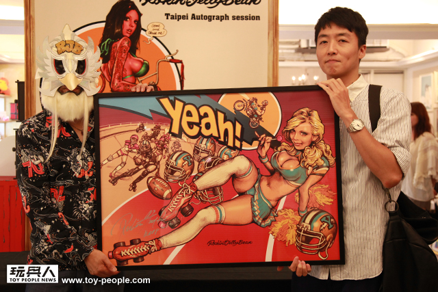 蒙面插畫大師Rockin’Jelly Bean 終於來台灣舉辦簽名會啦!這是大師繼2010 年TTF之後,第二度來台舉辦簽名會。與第一次簽名會不同的是,這次Rockin’Jelly Bean 與台灣廠商“yeah!”以及Rockin’Jelly Bean 在台灣的經紀公司"LIRO"合作推出了許多商品,讓粉絲蜂擁而至,雖然當天晚上6點半才開始的簽名會,卻有超級熱情的粉絲早在4點就前往排隊!