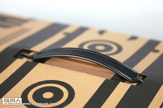 ↓ 非常巨大的外箱包裝!外觀使用了與著裝整備台相似的幾何造型圖樣作為設計,使用單純的紙箱作為設計,更容易與著裝整備台的機械手臂工業風格形象結合。