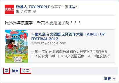 1.到『玩具人』本次的第九屆台北國際玩具創作大展 TAIPEI TOY FESTIVAL 2012文章按“讚”,並分享至你的塗鴉牆。(分享必需加上心得!)