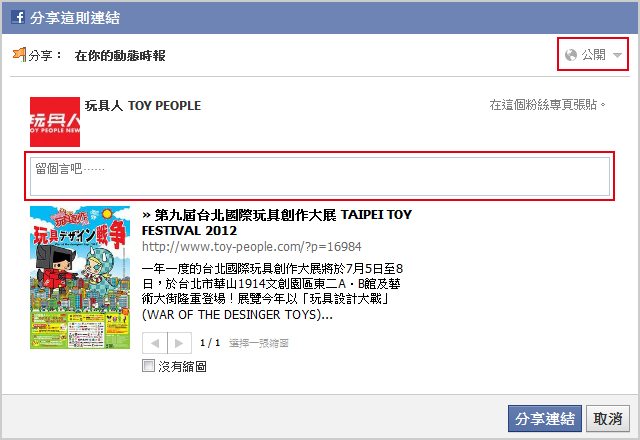 2.分享時記得右上角要設定為公開,並留下一段對於台北國際玩具創作大展活動的分享感言。