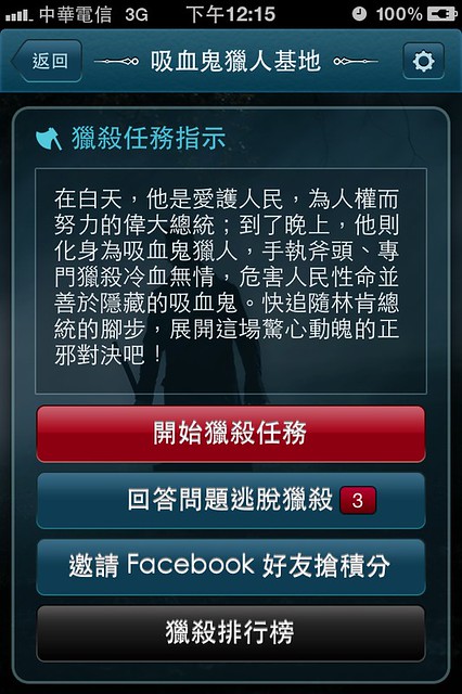 「吸血鬼獵人:林肯總統」推出了獵殺吸血鬼手機遊戲APP,該APP手機遊戲將電影的惡趣味與地圖定位、臉書以及趣味問答結合,玩家可以透過地圖定位或是臉書搜尋找到周遭隱藏的吸血鬼,進而狙殺;被狙殺的吸血鬼玩家會收到關於【吸血鬼獵人:林肯總統】的趣味問題,若回答錯誤,也將會被獵人玩家毫不留情地砍殺並公開於臉書塗鴉牆上,下手的方式會隨著問題的不同而改變,共有超過30種不同的趣味死法!無論是成功狙殺吸血鬼或是順利逃脫獵人的狙殺,都可獲得遊戲積分,只要遊戲積分超過100分,就有機會搶先觀賞【吸血鬼獵人:林肯總統】!