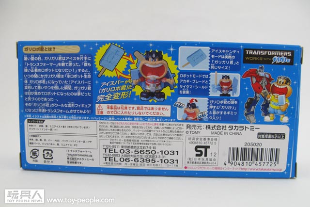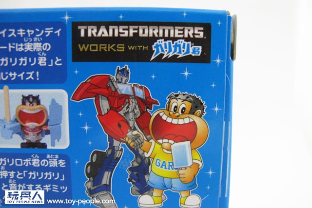 ↓ 紙盒的背面包裝還有變型金剛科博文和ガリガリ君握手的樣子真有趣。