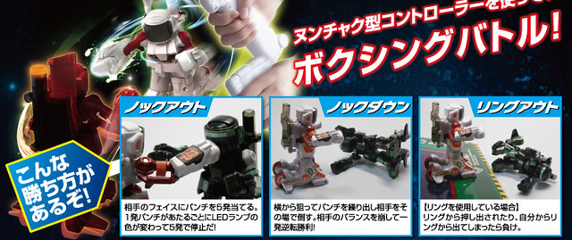 「擊倒」戰鬥中機器人的體力會用臉部的LED燈來表示受到的傷害,綠→藍→白→黃→紅 最後體力扣盡便判定為「擊倒」,「倒地」指的是戰鬥中意外的被對手擊中而倒地,而「出界」需搭配額外購買的戰鬥台,機器人會偵測是否在戰鬥台上,只要因戰鬥離開就算「出界」;控制器中內建喇叭會能夠發出各種戰鬥音效,每次充電20分鐘即可遊玩10分鐘,並且最大支援20名玩家對戰!