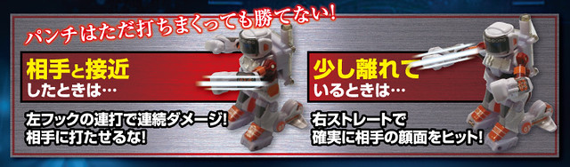 這一款戰鬥機器人利用無線遙控,宛如電影『鋼鐵擂臺』真人動作控制機器人般,使用左右手的動作來控制機器人的揮拳與前進,並且利用LED 顏色變化來表達機器人受到的傷害,被擊倒的機器人就會發出“逼~逼~”的音效並自動暫時失去動作的功能(被擊倒的三種判定:擊倒、倒地、以及出界)