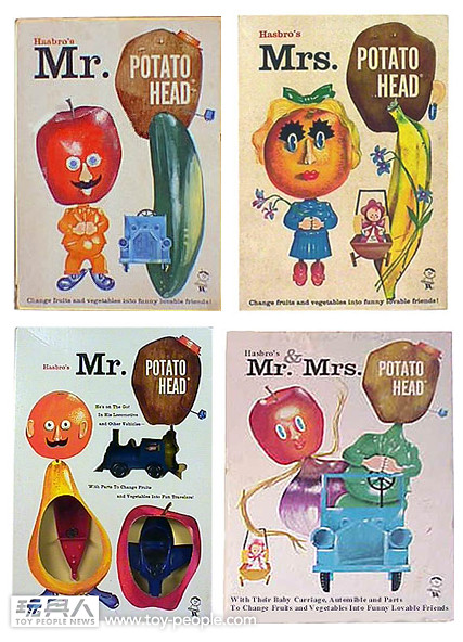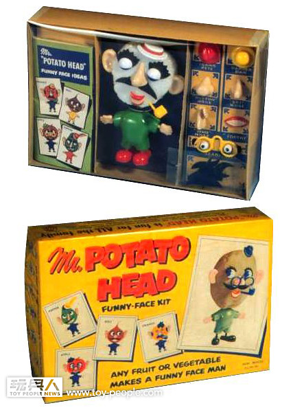 在美國第一代的蛋頭玩具,售價約1美元,當時的全名是「Mr. Potato Head Funny Face Kit」。而在那個時候,其實還沒有附上現在的塑膠馬鈴薯頭,而是只有30個左右的眼睛、鼻子、嘴巴、四肢與鬍子等等配件。小朋友可以利用家中的蕃茄、小黃瓜、等蔬果拼出專屬於自己的「蔬果」先生(小編有親身拿蕃茄和小黃瓜試過,除了最後要吃掉很痛苦之外,還會爆汁喔!各位玩具人們可以來試看看)。