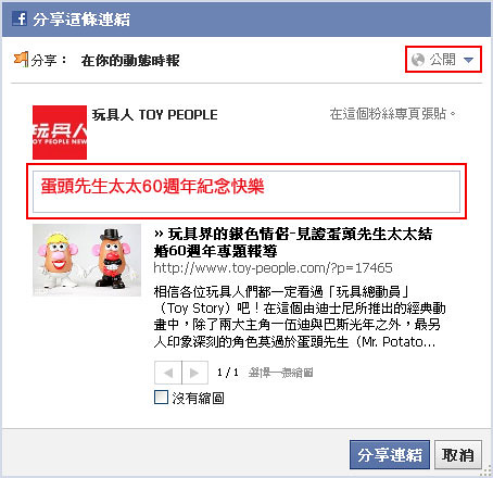 2.分享時記得右上角要設定為公開,並留下「蛋頭先生太太60週年紀念快樂」在你的塗鴉牆上喔。