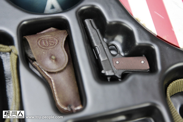 ↓ 電影「美國隊長」中美軍的標準配備之一,柯爾特 M1911A1 手槍與專用槍套,這個配備也在MMS 156 的美國隊長中出現。