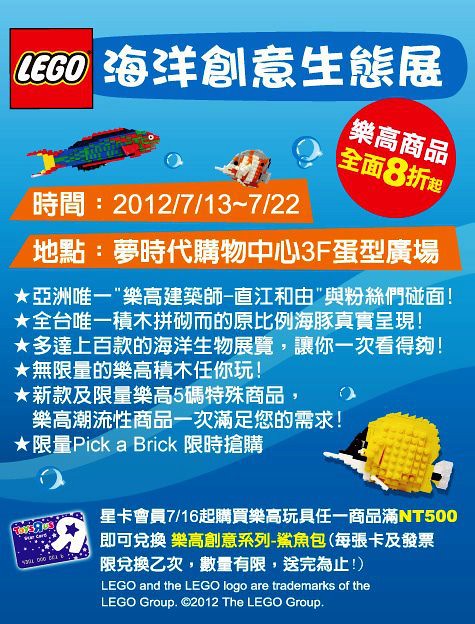 在高雄夢時代的購物廣場3樓現正舉辦樂高海洋創意生態展,展期從2012年7月13日-2012年7月22日,喜歡LEGO樂高的朋友可以前往欣賞一下,現場樂高的相關商品全面8折起,有興趣的朋友請參考出處相關連結,有更多照片可以瞧瞧,消息提供給喜愛LEGO樂高的玩具人參考。