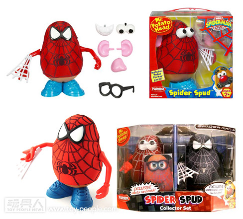 Marvel英雄的另外一位全球廣受歡迎的角色-蜘蛛人的電影在2007年蜘蛛人3電影推出時,孩之寶也有推出的一系列的「Spider Spud」。除了單一版本的紅蜘蛛人之外,其實兒樂寶(PLAYSKOOL)還有推出一個特別版雙人組的蛋頭蜘蛛人喔!其中包含了紅蜘蛛人與黑蜘蛛人,搭配了與過往不同的盒裝設定,讓這款雙人包的Spider Spud一推出後立即被搶購一空!