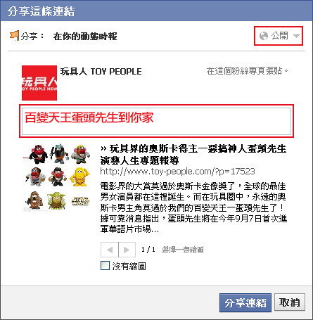 2.分享時記得右上角要設定為公開,並留下「百變天王蛋頭先生到你家」在你的塗鴉牆上喔。