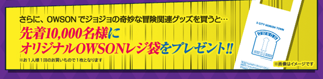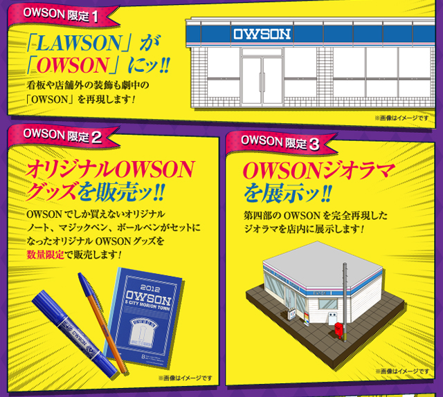 這是日本知名連鎖便利商店“LAWSON”,為了配合JOJO冒險野郎連載25週年、以及JOJO展所做的宣傳,“OWSON”期間限定店開設於“JOJO冒險野郎”第四部舞台設定S市杜王町所在的仙台市,所有的外觀將改變與漫畫中所出現的“OWSON”一模一樣,並且推出多樣限定商品以及專屬購物袋,並且日本全國的“LAWSON”也將於9月4日推出“JOJO冒險野郎” 的促銷活動!“OWSON”期間限定店將於7月18日~9月30日開放,各位JOJO 迷請把握機會前往朝聖吧!