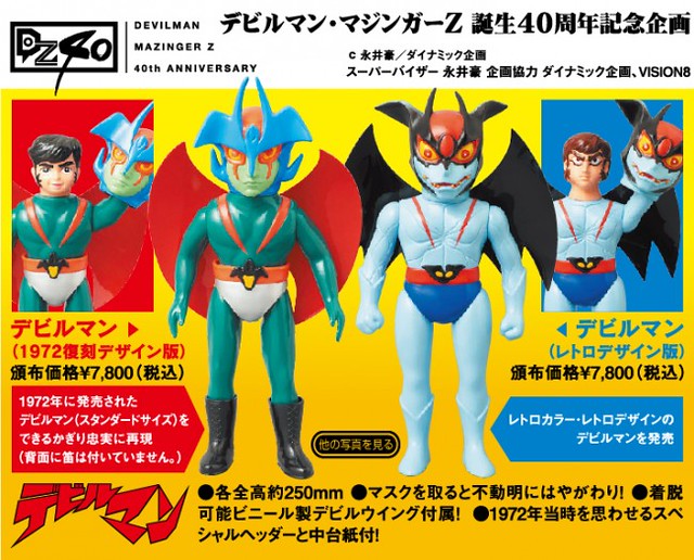 日漫畫大師永井豪老師的經典作品惡魔人在今年滿40週年,很多相關週年相關企劃的商品都預計在今年推出,日MEDICOMTOY 1/6 限定線上商店推出デビルマン(1972復刻デザイン版) 和デビルマン(レトロデザイン版)下方照片,惡魔人1972年復刻版本和復古版本,預計在2012年9月1日00時~2012年9月30日線上接受付款預訂,2012年11月才發行,全高約25公分,官網最下方的資訊還指出這項商品會在8月17日於東急表参道原宿5F トーキョーズトーキョーにて展覽中,DZ40(ディーゼットヨンジュウ)會場先行販賣,售價約7,800元日幣。