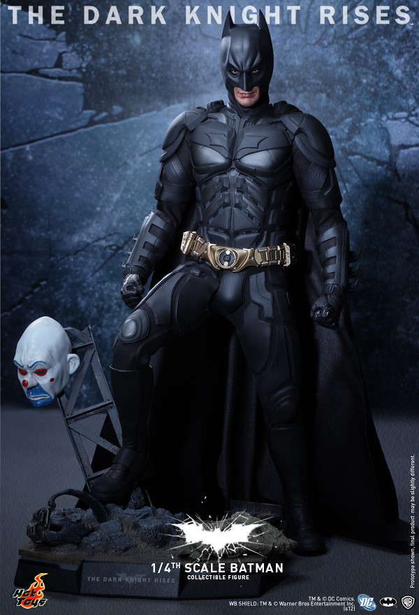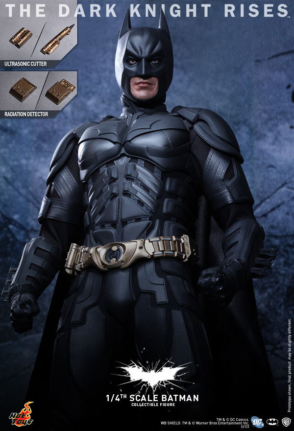 Hot Toys 推出了諾蘭蝙蝠俠三部曲最終章「黑暗騎士:黎明升起」1/4比例 蝙蝠俠。這一個新款的蝙蝠俠淘汰了過去的包膠素體技術,使用全新技術以塑料+布料的方式製作蝙蝠裝,搭載Hot Toys 專利的可動眼系統,並且還搭配了許多精彩細製的配件,以及三款過去敵人所穿戴的面具。另外還將有附贈蝙蝠俠面具的SP版。