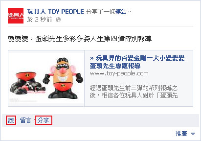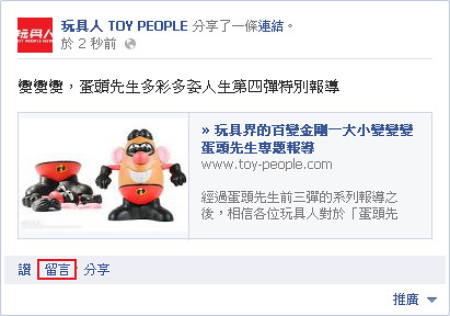 2.「玩具人 TOY PEOPLE NEWS Facebook 粉絲團」上側。