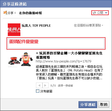 2.分享時記得右上角要設定為公開,並留下「蛋頭配件變變變」在你的塗鴉牆上喔。