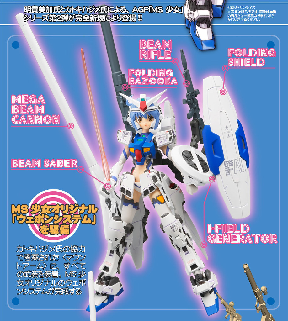 以「超合金」「ROBOT魂」兩大系列累積的機械人技術、可動性以及風格,加上「S.H.Figuarts」「Figuarts ZERO」結合的技術技巧,將「アーマープラス」成功的與美少女造型結合。第二彈“MS少女 GP-03S STAMEN”,豐富的武裝可裝備在原創手臂與關節。並附有大魄力150mm的光線來福槍!以及包含了I力場發生器...等充實的原創要素!